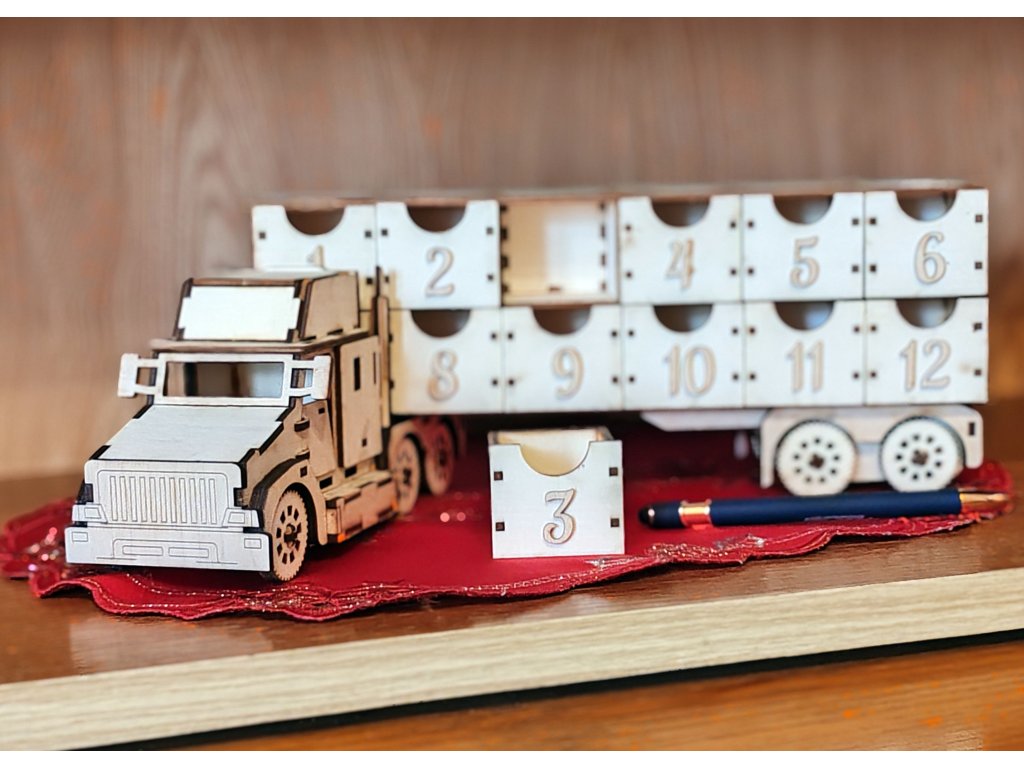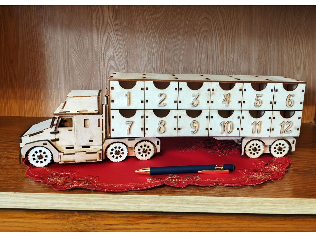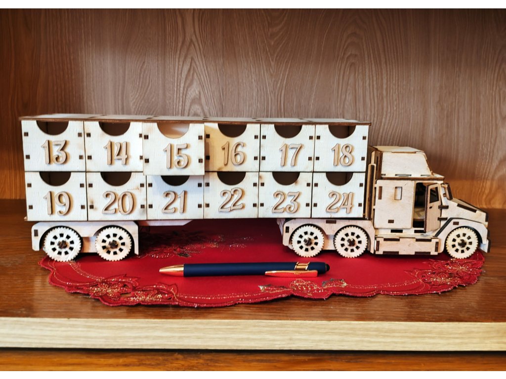 Nagyon különleges Adventi naptár, ami egy kamiont formáz. Nagy meglepetés lehet kicsiknek, nagyoknak egyaránt. Natúr rétegelt lemezből készült, így akik kedvet éreznek hozzá,ki is festhetik. Alkalmaz ehhez szinte bármilyen festék, vagy filc, amit egyébként is fára ajánlanak. 24 db kis fiókjába, amik két oldalon helyezkednek el, apró ajándékokat lehet tenni, amik különlegessé teszik az ünnepvárást. A kis fiókok mérete 4x4x4 cm. A kamion két részből áll, a pótkocsi leakasztható.