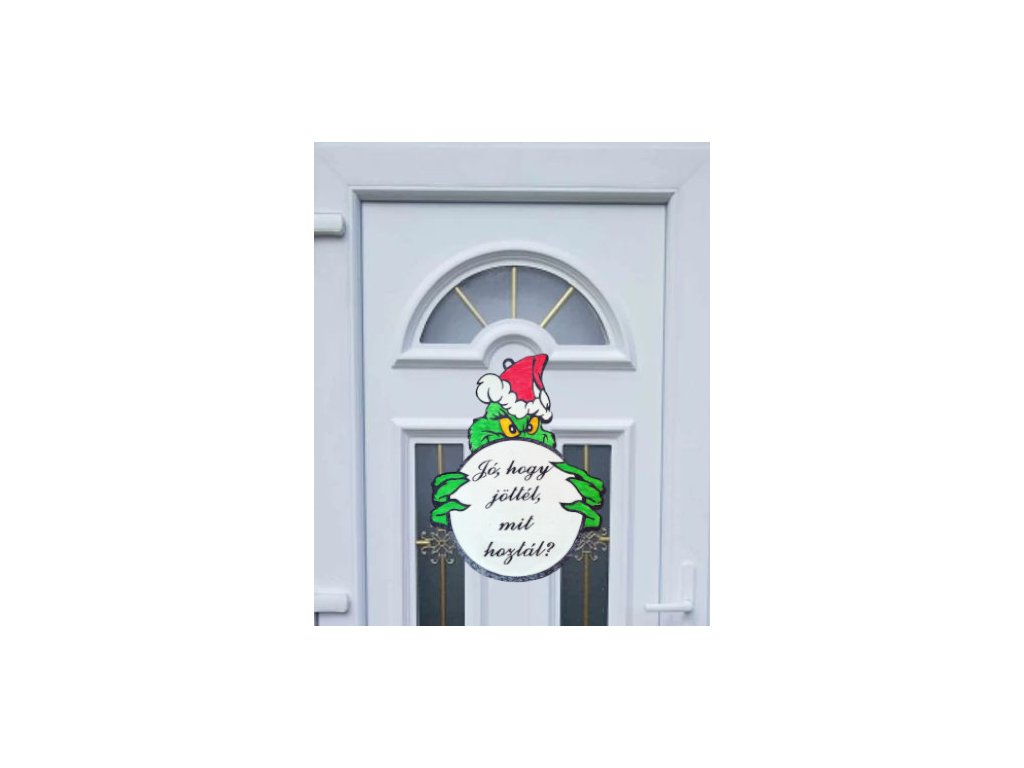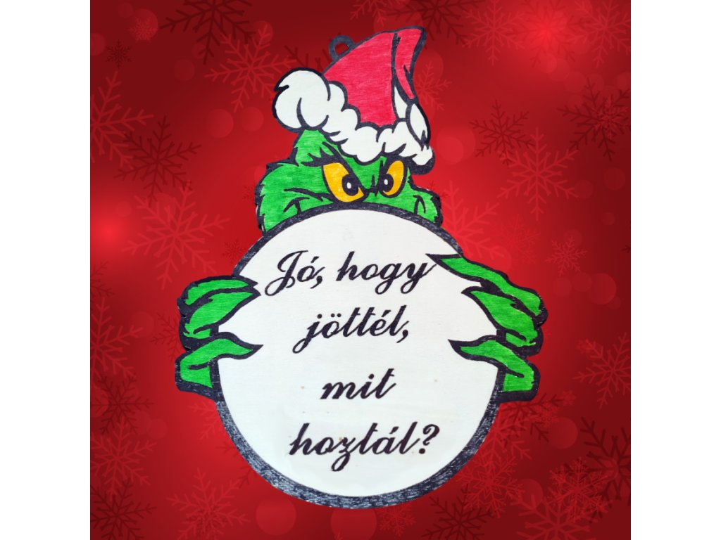 Egy sajátos és vicces megközelítése a karácsonyi vendég köszöntésének. Ajtóra függeszthető kézzel festett grincses tábla, "Jó, hogy jöttél, mit hoztál?" felirattal. Akár tovább is díszíthető. Igény szerint a felirat lehet más is.