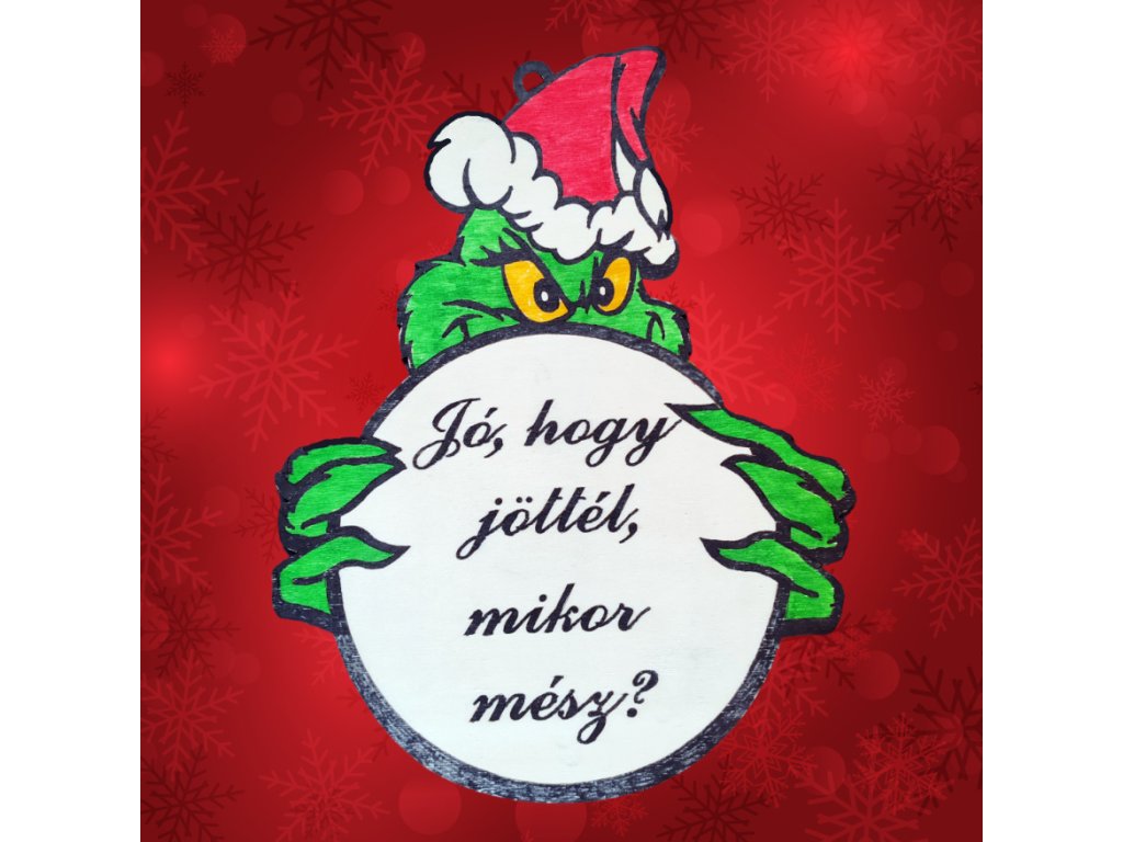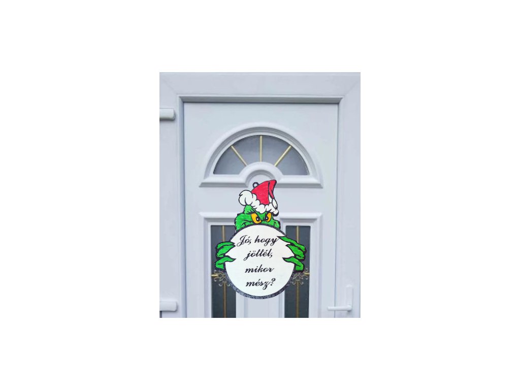 Egy sajátos és vicces megközelítése a karácsonyi vendég köszöntésének. Ajtóra függeszthető kézzel festett grincses tábla, "Jó, hogy jöttél, mikor mész?" felirattal. Akár tovább is díszíthető. Igény szerint a felirat lehet más is.