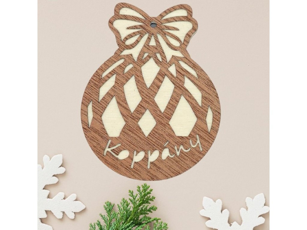Névre szóló, egyedi fenyődísz, karácsonyi gömb, fa intarziás