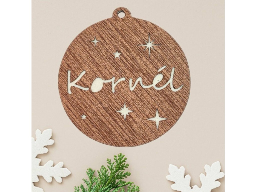 Névre szóló, egyedi fenyődísz, karácsonyi gömb, fa intarziás