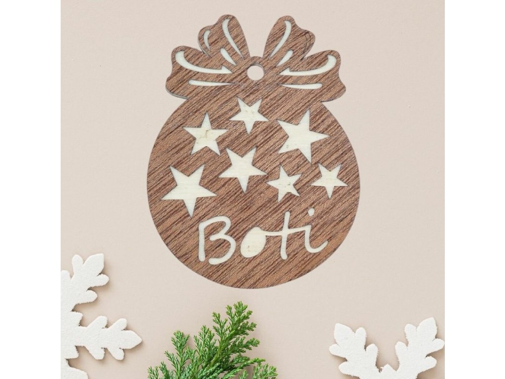 Névre szóló fenyődísz, karácsonyi gömb, hagyományos mintával, ami valódi mahagóni fa intarziával készül. Bármilyen nevet, rövid szöveget lehet rá kérni. Megrendeléskor a megjegyzés részbe írd be a nevet, szöveget, amit szeretnél.